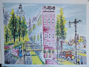 “A series of six colorful subjects, reproduced in full color lithography, inspired by a way of living — of ease and slow-paced leisure — which has become an integral part of the American tradition. Their joyous composition and gayety of color make these bright watercolors ideal for any decorating scheme.”