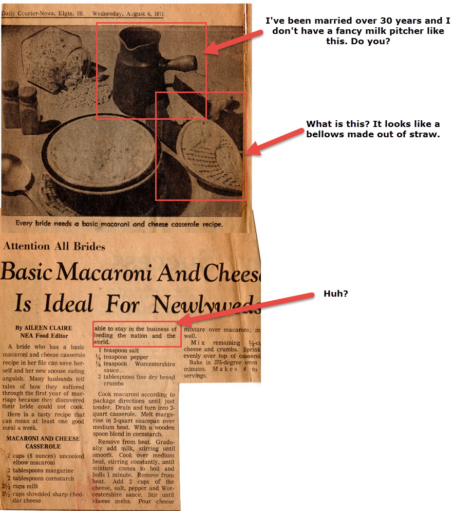 Hey 1971, I thought you were more progressive than this! And what newlywed couple has a fancy milk(?) pitcher like that? And what is that thing on the lower right of the photo?