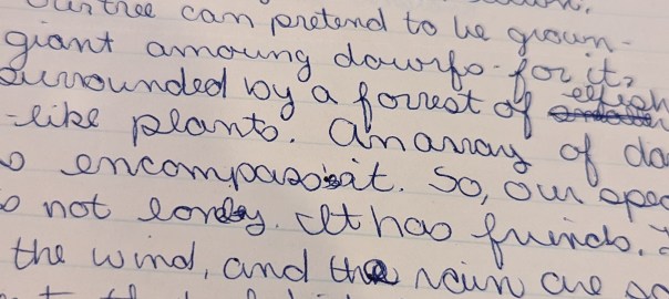 I remember writing this. Our teacher took us outside to write about what we saw on the school property. I wrote about a tree. I think I must have been a little obsessed with Shakespeare at the time since the beginning sounds like the opening lines of Romeo and Juliet, and then I mention a quote from Romeo and Juliet later on.