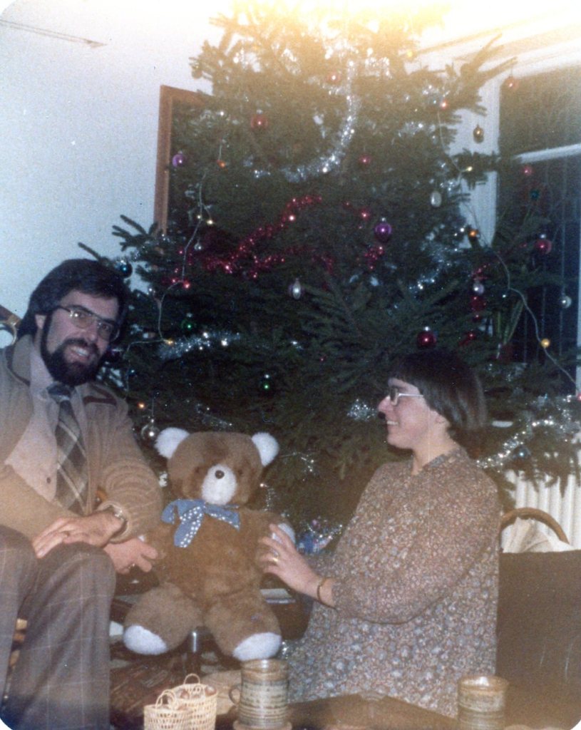 Here they are with Tobias Bear (their son) in front of a huge Christmas tree. December 9, 1978