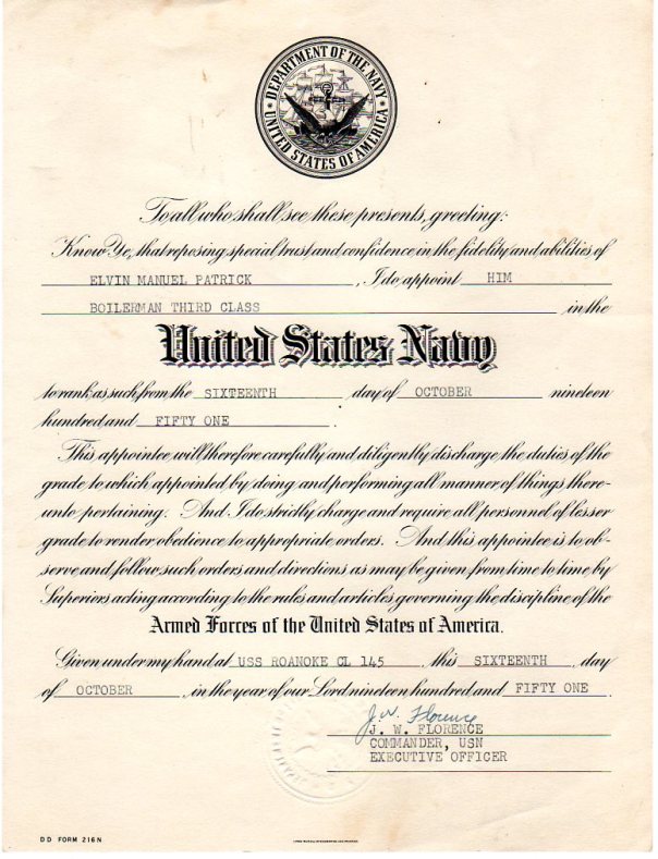 Elvin Manuel Patrick, I do appoint him Boilerman Third Class in the