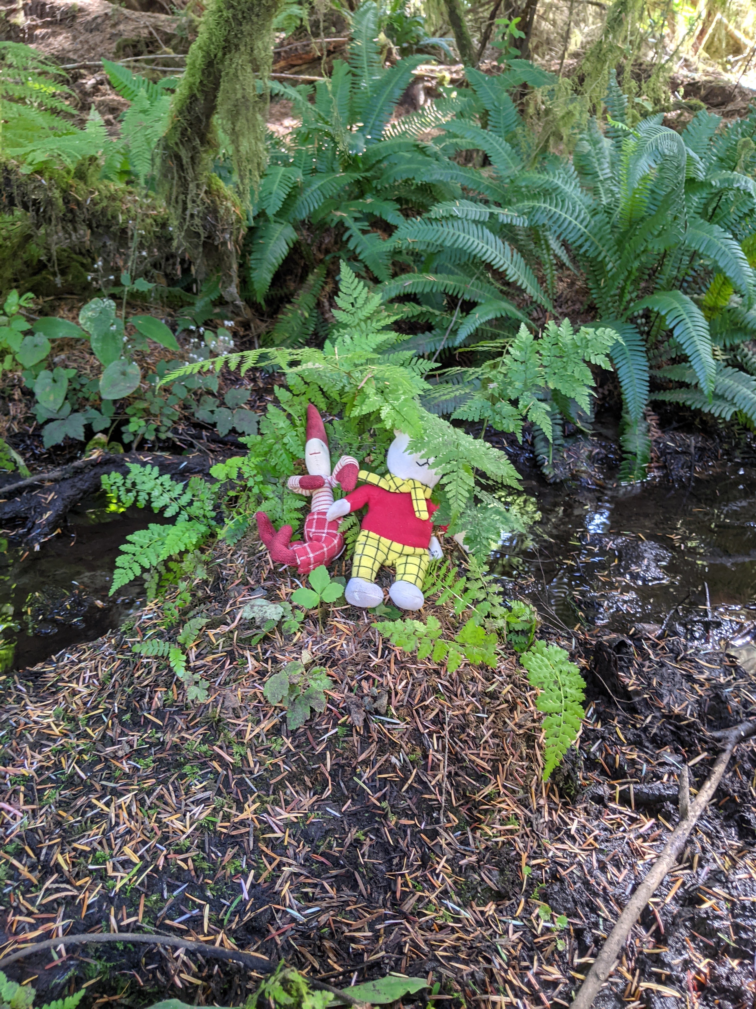 Yesterday we had a delightful walk through a mini rainforest a 4 minute drive from our Airbnb. This was my second or third time there and it was as lovely as I remembered. I brought Rupert and Chum along and near the end of the walk a little girl exclaimed in delight to her mother “Look, she has a bear!” Of course I stopped and introduced her to Rupert and Chum. The little girl said she had a friend in her mother’s backpack and begged her mother to get out the friend. It turned out to be a small Orca whale named (I think) Stash. Stash, Rupert and Chum chatted for a bit, posed for a group photo and then we all parted ways after assuring the little girl that we’d chat again next time we met up at the park.