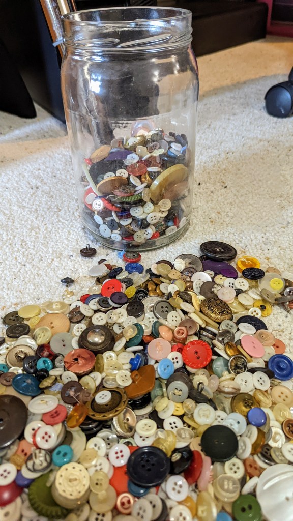 When I was a child my mom sewed a lot. She was also frugal, so she reused buttons. I always remembered a large jar of buttons in the linen/sewing closet in the hallway connecting our bedrooms with the bathroom. That large jar came home with me after my mother died.