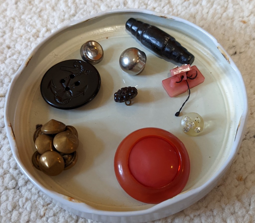 I just dumped out the entire jar of buttons looking for the lozenge-like button, but mom must have used it for something because it’s not there. However, some other buttons I remember were there. The pink buttons have four glass diamonds on the front — I should have made sure to take a photo of the fronts! The long black one was from an old p-coat. The round black one was from my dad’s navy dress clothes or coat. I think the dome-shaped silver button was from one of my winter coats. I am pretty sure I put that in my mouth more than once too. The big round red button was from my mom’s coat, I think. The others I just remember, but don’t know where they came from.