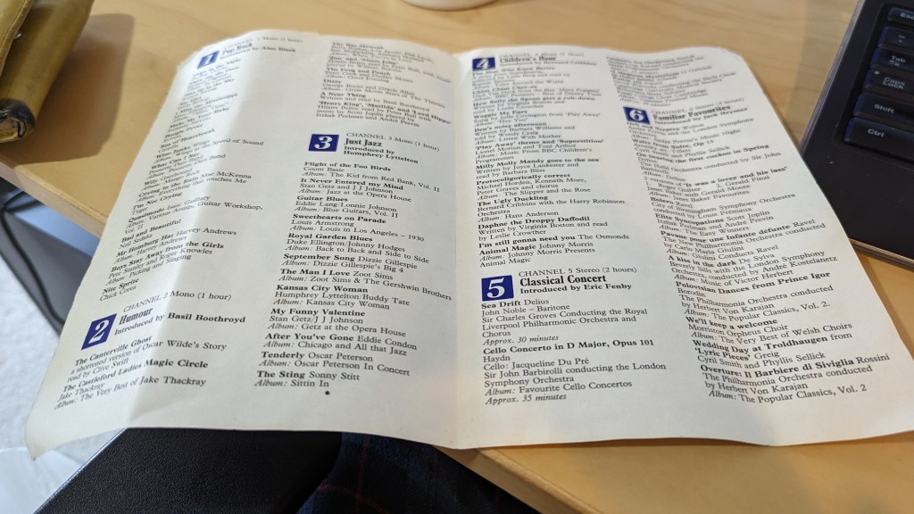 Back in the olden days we were given head phones that plugged into the arm of the airplane seat and we had a choice of things to listen to. We also had films to watch, but if I remember correctly they were on high screens located throughout the airplane, not on the back of the seat in front of us. I don’t think I listened to much of this music, but maybe I did.