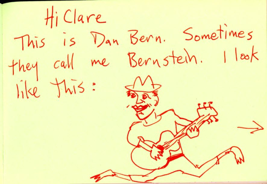 One night I was planning on taking her to go see my favorite singer/songwriter, Dan Bern. Clare was unable to go with me — maybe she was sick. Anyway, I went on my own. We decided that maybe I could have Dan write his autograph her new autograph book.