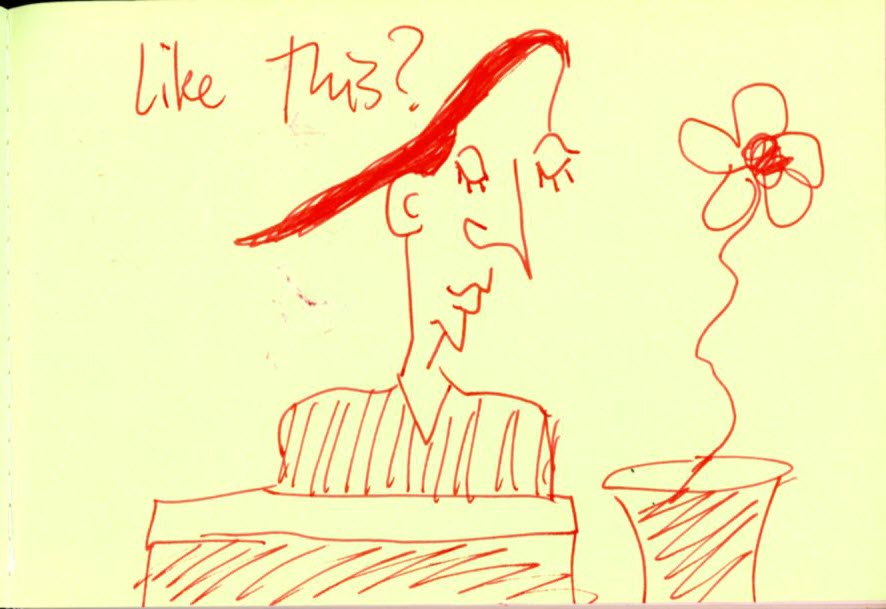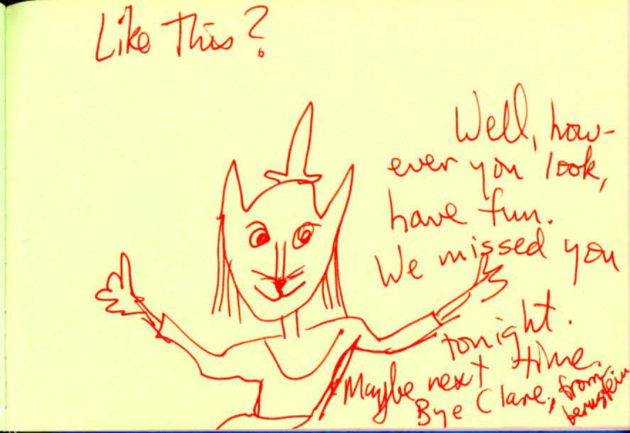 I expected him to sign his name, and maybe write a quick note. I sat back down while he was writing — it seemed to take a while and I wondered if he didn’t know what to say and started getting embarrassed. Minutes later he handed me the book and said he hoped it was okay with Clare that he used more than one page. I was dumfounded when I looked at what he wrote. And drew.