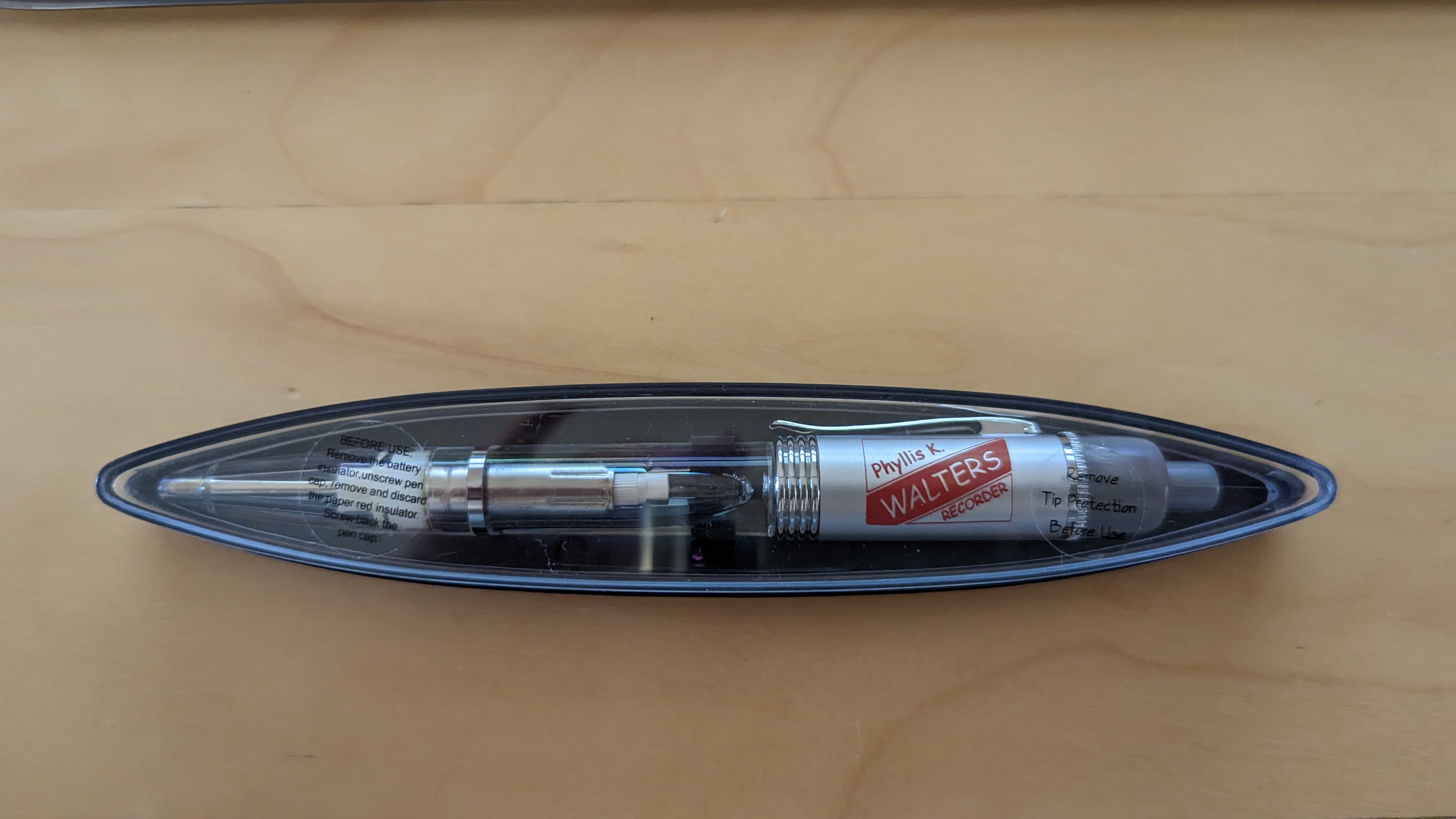 Among the items I brought home from my Mom’s house was a strange looking pen in a canoe shaped box. On further inspection “Phyllis K. Walters, Recorder” could be seen in red on the side. On even further inspection (taking the pen apart), the inside of the top barrel contained three coin batteries, long spent, as far as I could tell.
