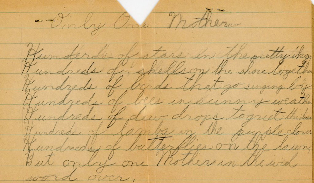 Only One Mother Hundreds of stars in the pretty sky, Hundreds of shells on the shore together Hundreds of birds that go singing by Hundreds of bees in sunny weather Hundreds of dew drops to greet the dase Hundreds of butterflies on the lawn, But only one Mother in the wid word over.