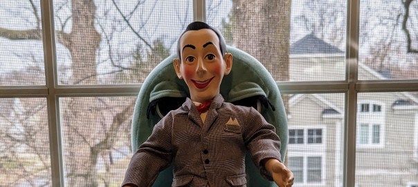 The backstory is simple. I loved Pee-wee’s Playhouse in the late 1980s and early 1990s and couldn’t wait to share it with my future children. The colorful set and wacky characters were perfect for my slightly off-kilter sense of humor. So one Christmas my mom presented me with a talking Pee-wee Herman doll and a Chairy puppet.