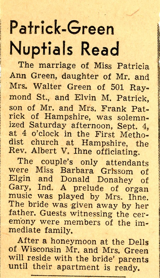 The marriage of Miss Patricia Ann Green, daughter of Mr. and Mrs. Walter Green of 501 Raymond St., and Elvin M. Patrick, son of Mr. And Mrs. Frank Patrick of Hampshire, was solemnized Saturday afternoon, Sept. 4, at 4 o’clock in the First Methodist church at Hampshire, the Rev. Albert Ihne officiating.
