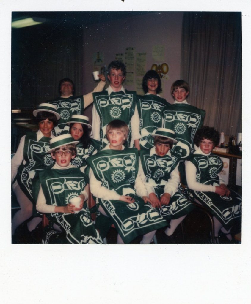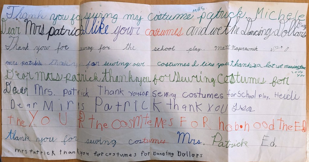 The music teacher decided that my students would be dancing dollars that were a result of someone dreaming about money. (I don’t remember the rest of the play, but I do remember my students’ performance). I was no good at choreographing so a friend helped me out. I think my students stole the show. Another friend silk screened the dollar image on the felt. I think I sewed the costumes at the shoulders and waist. Or perhaps my mom did.