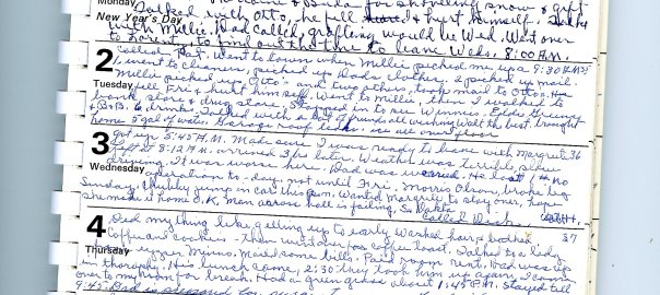 Saturday January 13, 1973 (day 46): Tie came tonight. Dad was restless all day. Oh if he could only get out of bed. Nancy called. They’re fine. Talked with boys too. Dick called, talked with girls. This perked him up. Walked to store to get cigs. Beautiful day. Came to my room at ten.