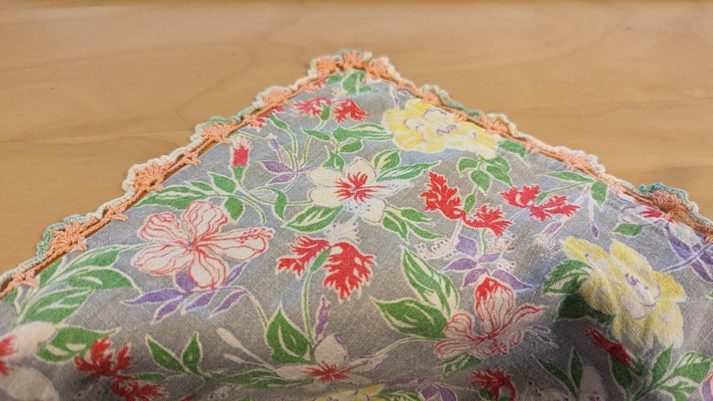 The tablecloth has a pattern of different types of flowers on a gray background with a crochet trim. The material is is soft to the touch, but strong. I’m willing to bet it was made from a feed sack, but of course no one is left to confirm my suspicion.