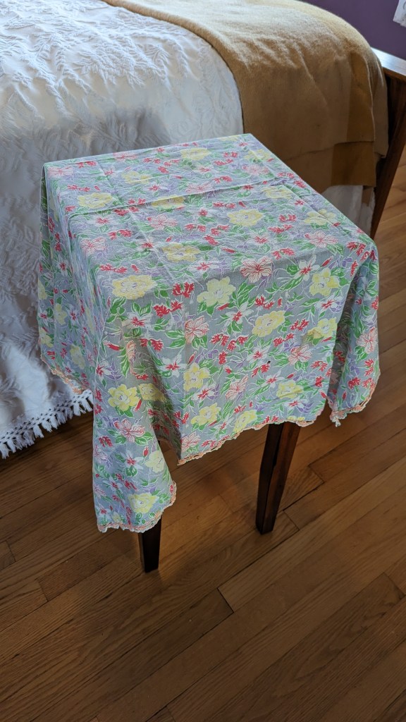 I’ve decided that it should not sit in a plastic bag in the storage area of my attic, but be displayed somewhere in the house. It’s now covering a too-dark bedside table in the purple guest room.