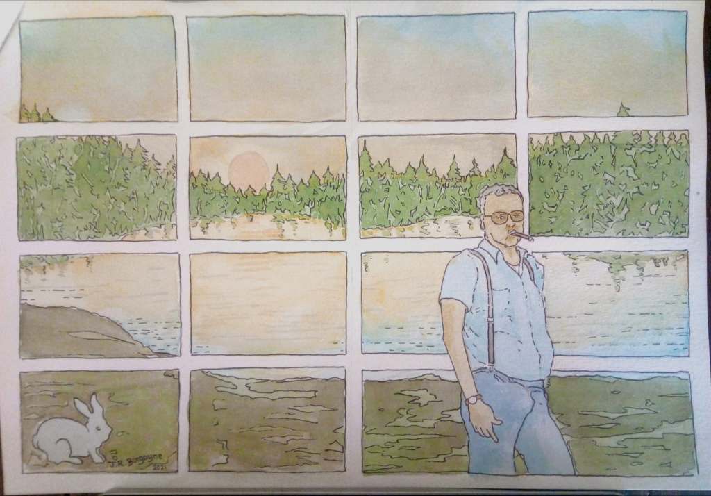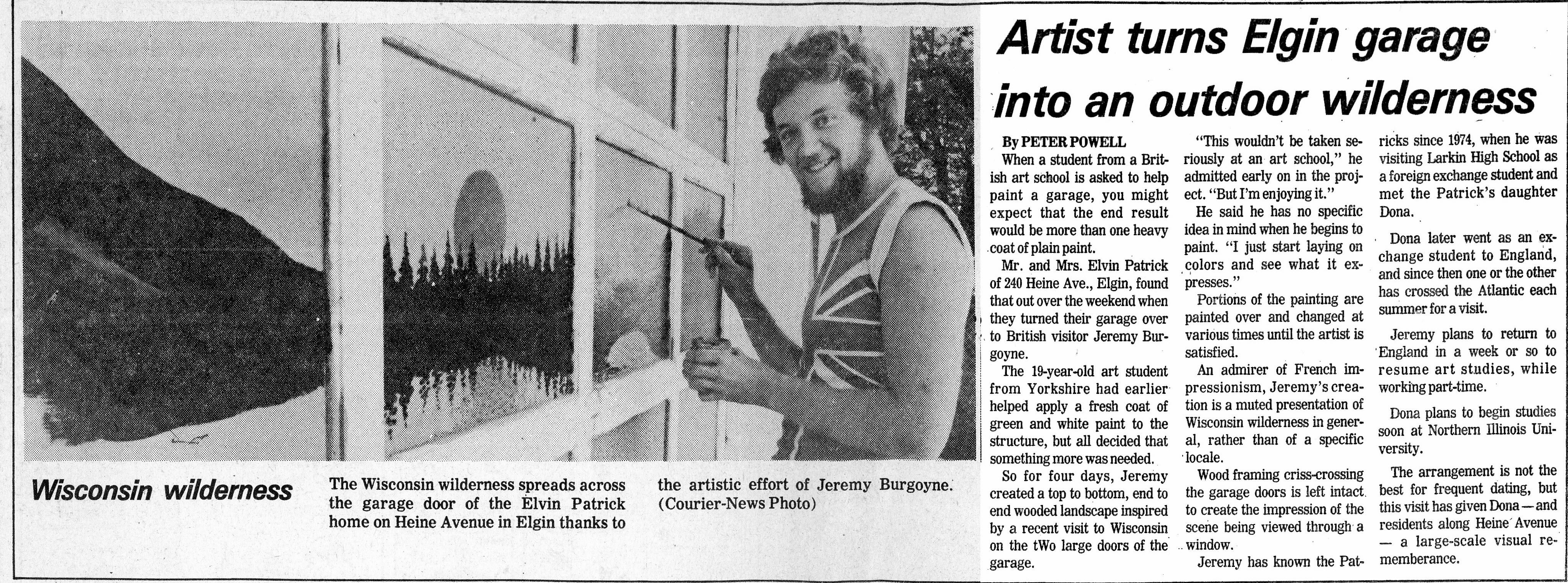 In 1977, shortly before he was to head back to England, my then boyfriend Jeremy, painted a North Woods scene on our garage doors in Elgin. It was his interpretation of the scene out the window of our vacation home in Hazelhurst, Wisconsin. The local paper even picked it up and for weeks people would slowly drive by the house to get a peek at the garage doors.
