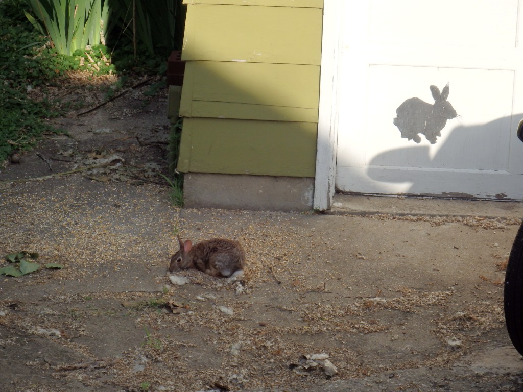 It’s hard to see the bunny in the lower left corner on any of the photos of the complete door, but when Mom eventually had the doors painted over (we neglected to put any kind of weatherproofing on the painting) she left the bunny. Here it is with a real live bunny and a detail from the painting Jeremy made for Kevin.