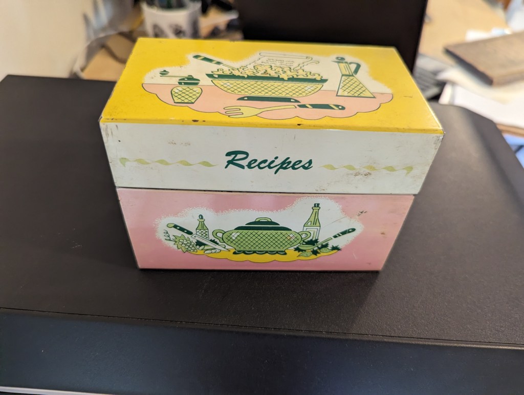 Mom kept her clipped and hand-written recipes in this metal recipe box. She consulted it when she needed a recipe she didn’t make often enough to have it memorized. I think she switched to an older, wooden box because that’s where her handwritten recipes are now. The metal one just contained a few items that came from newspapers, magazines, food packages, or appliance inserts.