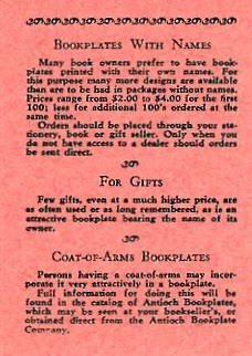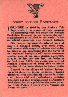 The Antioch Bookplate Company still exists, but is now called Bookplate Ink, and I could even order a set of Pegasus book plates if I wanted to. The company has a blog which might provide interesting reading.