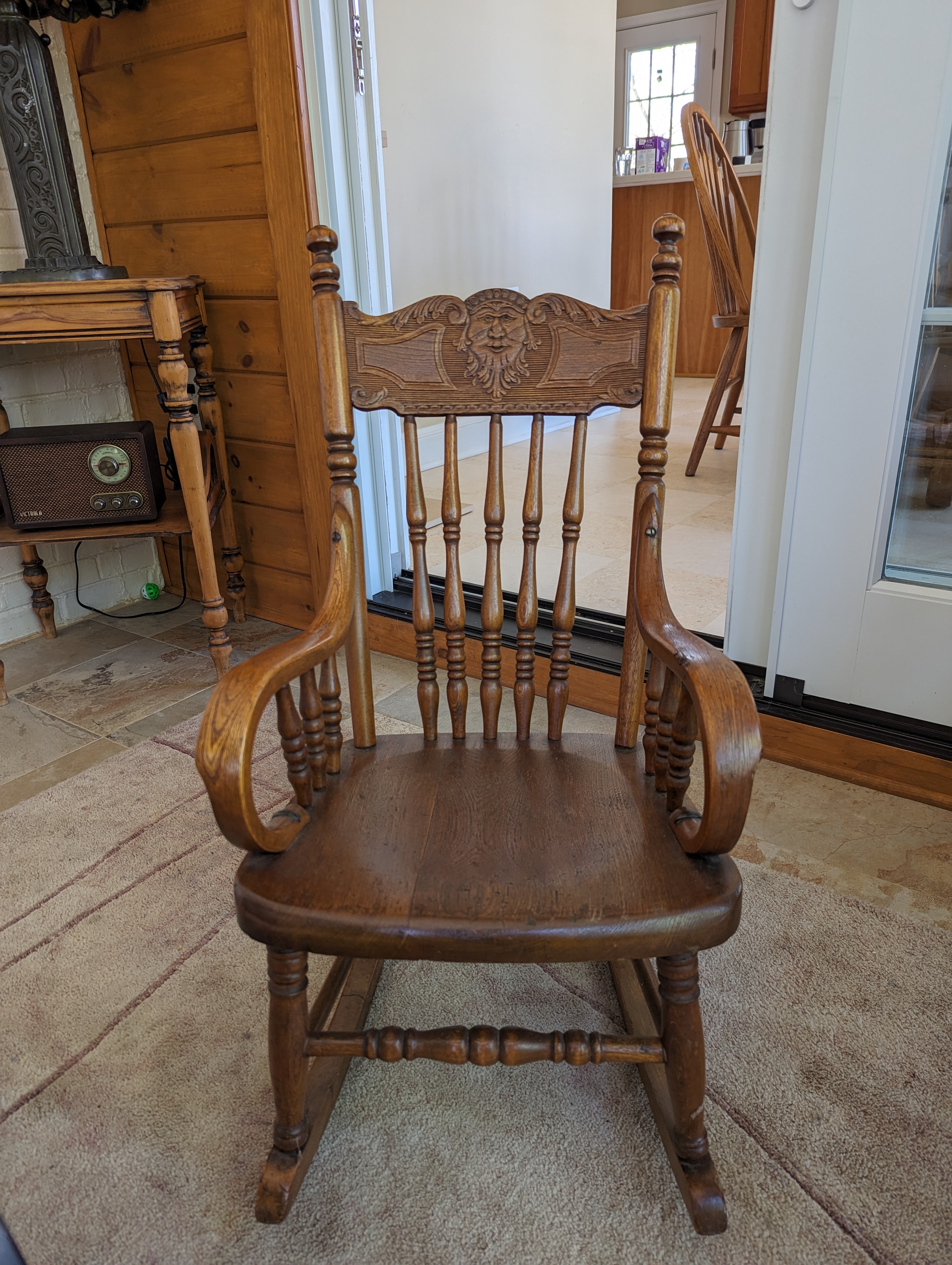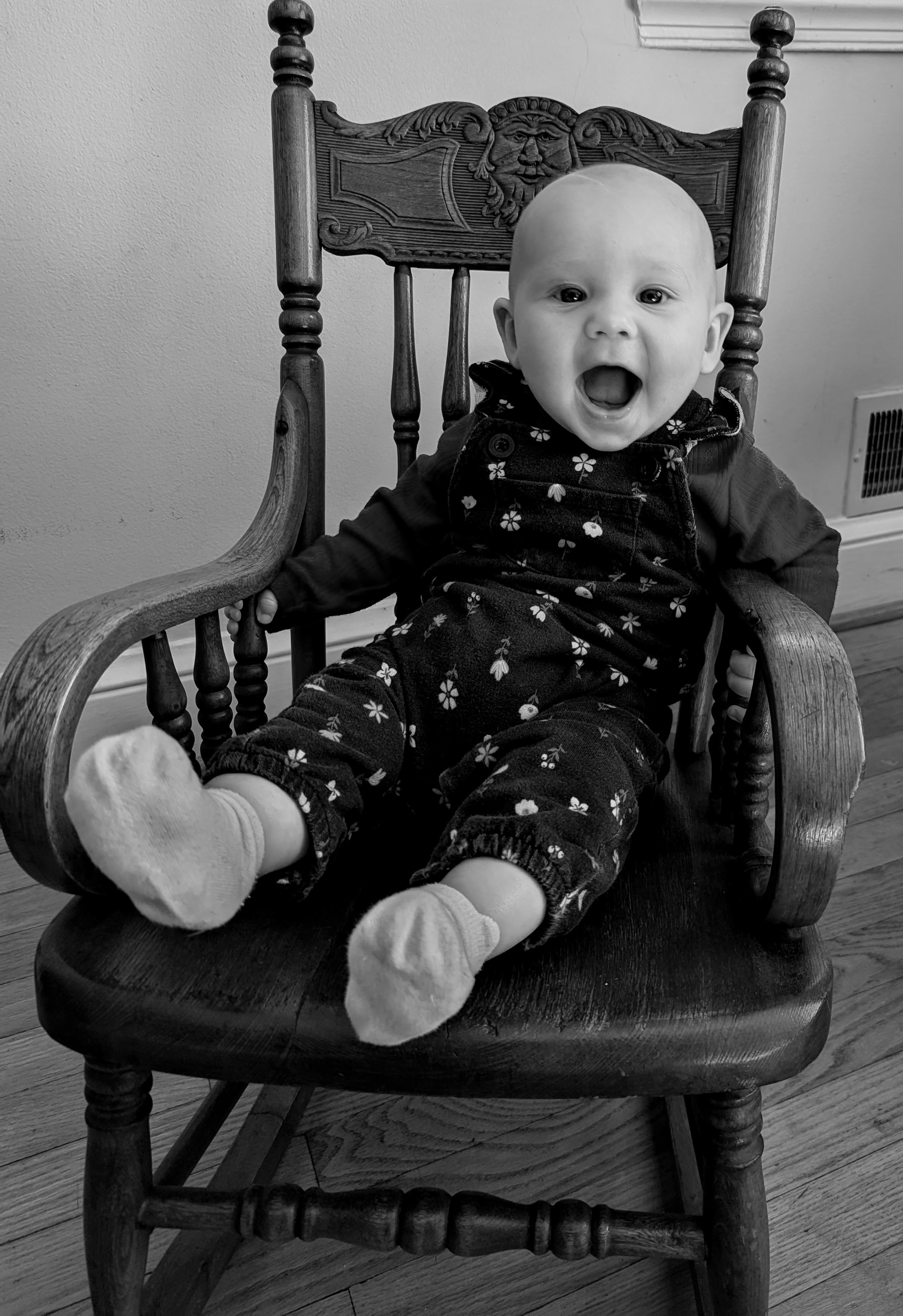 My grandparents had a child’s rocking chair when they lived in Elgin. Generations of children sat on it and I really wanted to own it someday for my own children. It went to my Aunt Ginny, the only of my mom’s siblings who didn’t have children. I think I did ask her for it when Clare was born, but she wasn’t ready to let it go. After she died it sat in storage until last April when Dean and I picked it up in Mississippi. So while I have no photos of my kids in the chair, I do have some of my granddaughter in it.