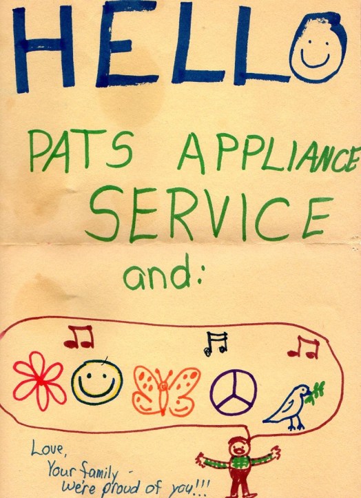 img007 October 1, 2016Full resolution (810 × 1119) ← Previous Next → Hello Pat’s Appliance Service and *drawing of someone saying only sweet nice things — flowers, happy faces, butterflies, peace sign, music*