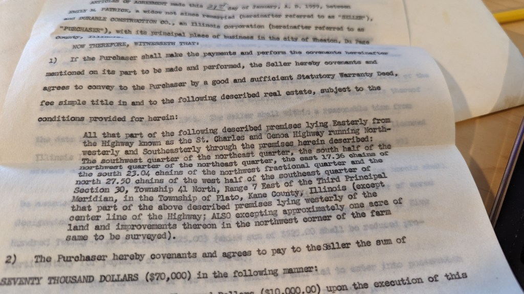 The other document is for the sale of the farm. It’s really too hard for me to figure out and I don’t have a scanner large enough to copy the whole thing, but one thing that stands out is how they determine the exact location of the farm and land. Back then I don’t think they had actual addresses for this particular area. In fact, all my Dad had to write on a post card to his sister who still lived on the farm was her name, town, and state. And when his mother wrote to him, the return address on the letter was simply Hampshire, Illinois.