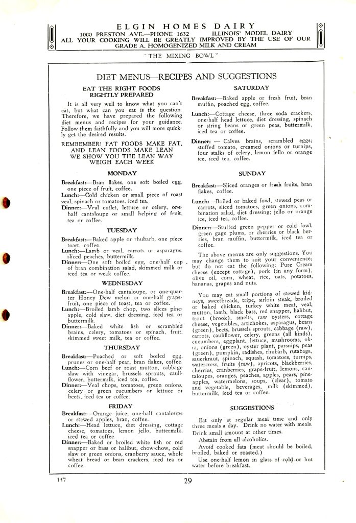 Breakfast: — Bran flakes, one soft boiled egg, one piece of fruit, coffee Lunch:– Cold chicken or small piece of roast veal, spinach or tomatoes, iced tea Dinner:– Veal cutlet, lettuce or celery, one-half cantaloupe or small helping of fruit, tea or coffee