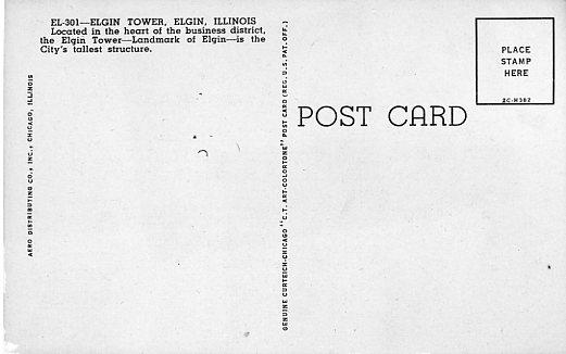 I have a vague memory of taking an elevator in which a man sat on a stool and pushed the buttons for my mother and me. I think it was when I got my first pair of glasses. I also think it was in this building. That is the only time I was ever in the Elgin Tower Building as far as I recall.