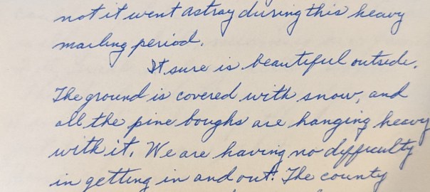 It sure is beautiful outside. The ground is covered with snow, and all the pine boughs are hanging heavy with it. We are having no difficulty getting in and out. The county plow has been down and our snow blower works good. It has snowed some each day, except one, since the 6th.