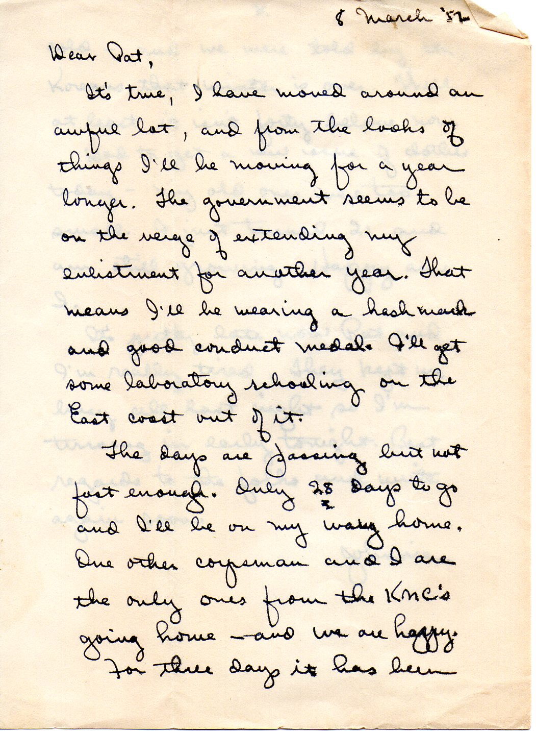 A big group of corpsmen left Korea today for the U.S.. As far as I can figure there are about 130 corpsmen in Korea that have been here for a longer time than I. March 25 (or April 25) cannot come too soon – that being the date I figure to leave here forever (I hope).