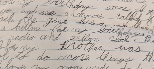 For my birthday once I got to go and see a movie called “Jack the Giant Killer” and then I got a kitten for my birthday. And I got a radio and alarm clock. But before my brother was born I got to do more things than now. I love my mom and dad. They spank me sometimes but I love them very much. They kiss me every day when I go to bed or when I get up in the morning or when I go somewhere and when I eat a good meal.