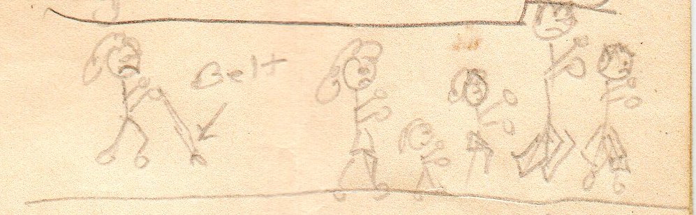 I’m guessing mom was about 10 or 11 when she made this card (which would make 1946 reasonable) because all of her siblings are in the drawing. From left to right, (the kids) is Mom. Then Aunt Ginny, then Aunt Nancy, then Uncle Dick and finally Uncle Bud. In 1946, though, Aunt Ginny would have still been an infant and not running.