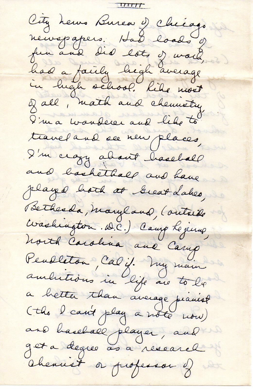 Was a student at the Art Institute for over a year and wrote with the sports division of the City News Bureau of Chicago newspapers. Had loads of fun and did lots of work, had a fairly high average in high school. Like most of all, math and chemistry. I’m a wanderer and like to travel and see new places, I’m crazy about baseball and basketball and have played both at Great Lakes, Bethesda, Maryland (outside Washington, D.C.) Camp Lejune, North Carolina and Camp Pendleton, Calif. My main ambitions in life are to be a better than average pianist (tho I can’t play a note now) and baseball player, and get a degree as a research chemist or professor of mathematics. Interesting?