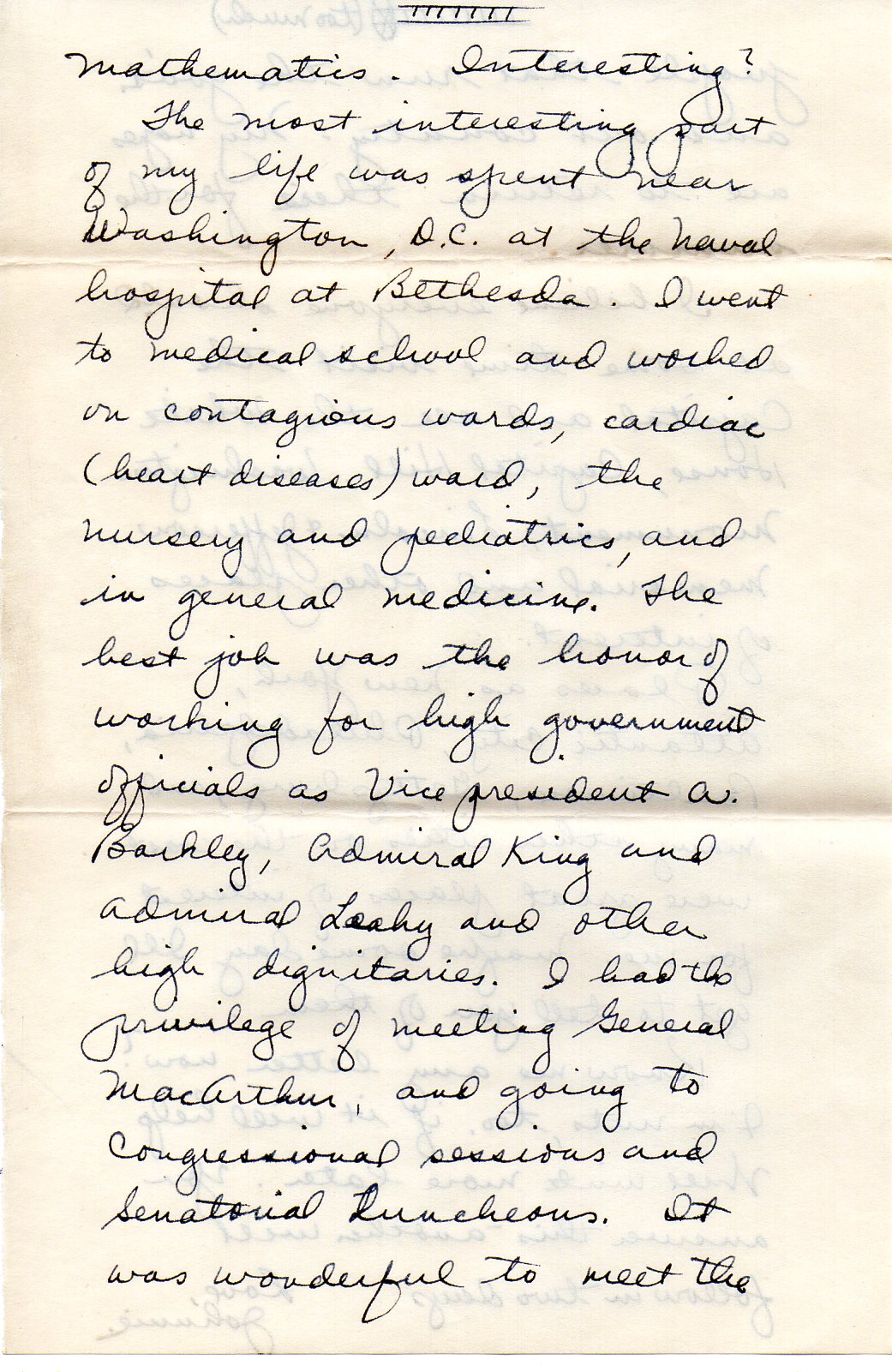 The most interesting part of my life was spent near Washington, D.C. at the Naval Hospital at Bethesda. I went to medical school and worked on contagious wards, cardiac (heart diseases) ward, the nursery and pediatrics, and in general medicine. The best job was the honor of working for high government officials as Vice President A. Barkley, Admiral King and Admiral Leahy and other high dignitaries. I had the privilege of meeting General MacArthur and going to congressional sessions and Senatorial  luncheons. It was wonderful to meet the people that run the gov’t and our country. My hopes are to return there for the summer.